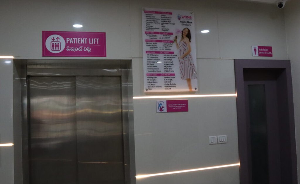 These signs help guide people through the facility, indicating the locations of different departments, clinics, patient rooms, restrooms, elevators, and exits.